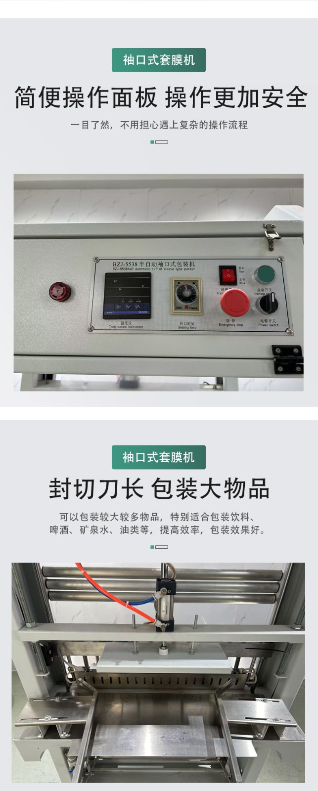 配备多重安全防护:加热区温度过载自动断电、封切刀防误触保护、设备异常时 PLC 自动报警并显示故障代码(如 “E01” 代表送膜故障),新手也能快速排查;模块化设计让易损件(如封切刀、硅胶条)更换便捷,维护成本降低 40%。