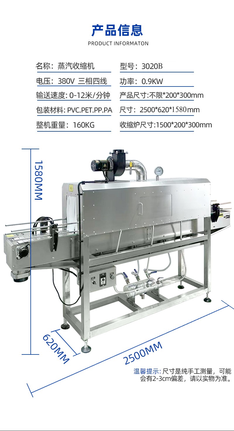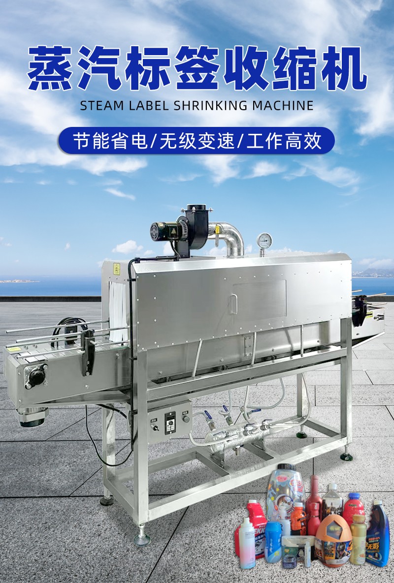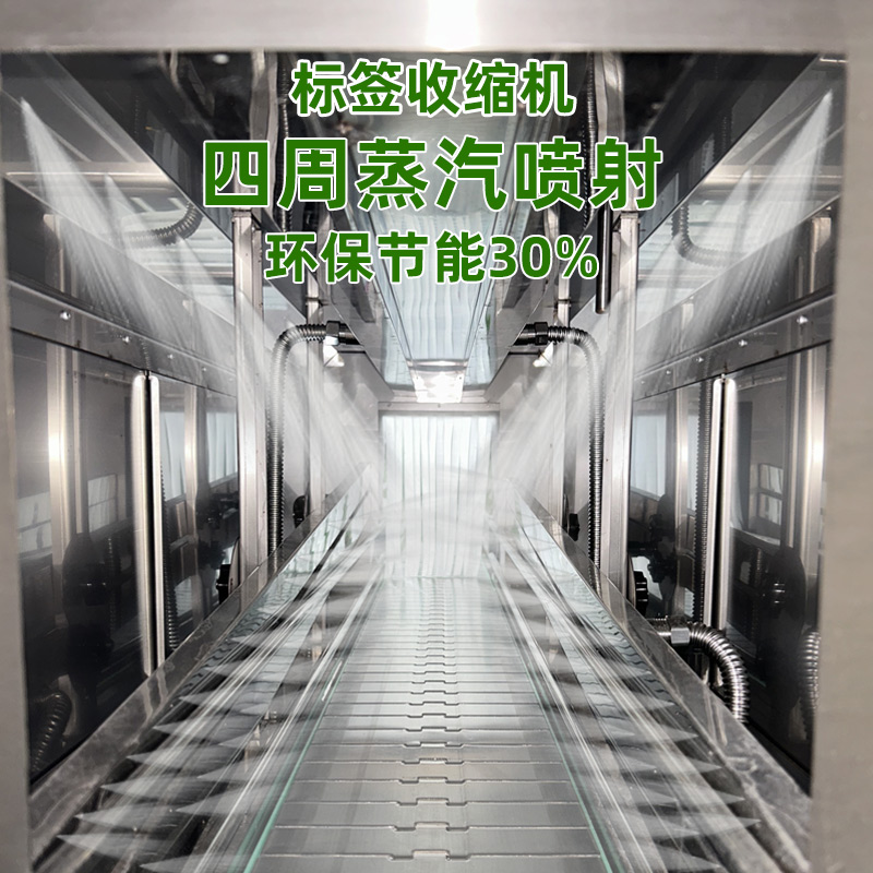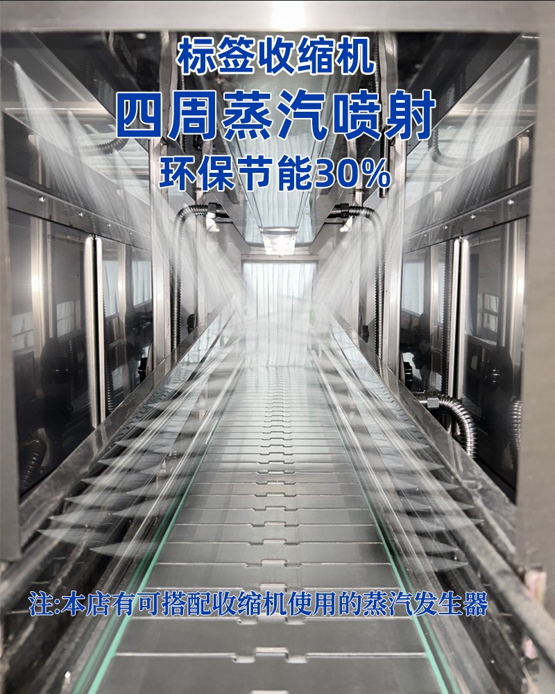 在收缩效果上,热风收缩受限于热风流动的不均匀性,容易出现局部温度过高或过低的情况,导致膜材收缩后表面产生褶皱、气泡,或边角处收缩不紧实,影响包装美观度;而蒸汽具有良好的渗透性和扩散性,能够均匀包裹产品和膜材的每一个部位,使膜材受热同步且均匀,收缩后能紧密贴合产品表面,无论是规则的瓶装,还是不规则的异形件,都能实现平整光滑的包装效果,大幅降低次品率。