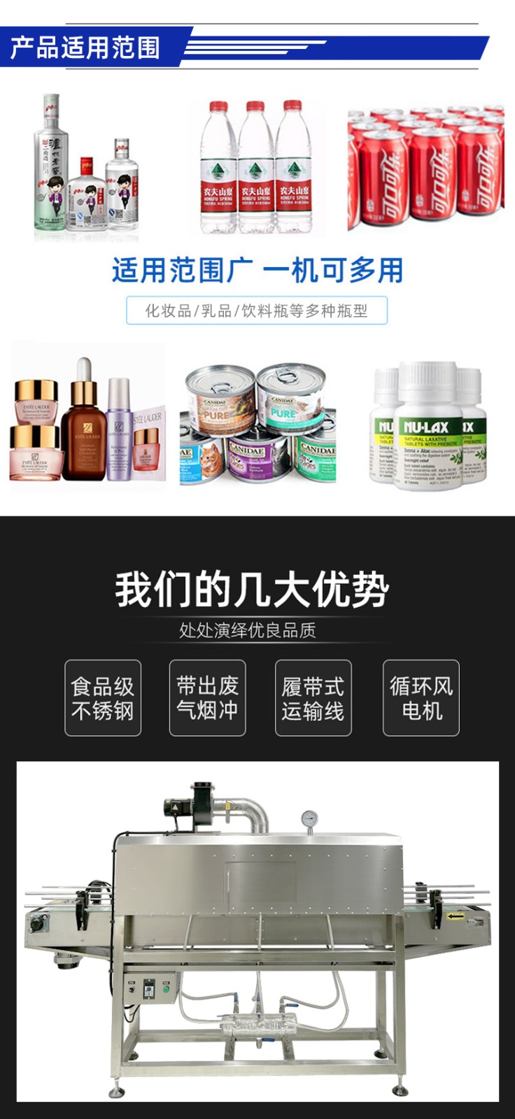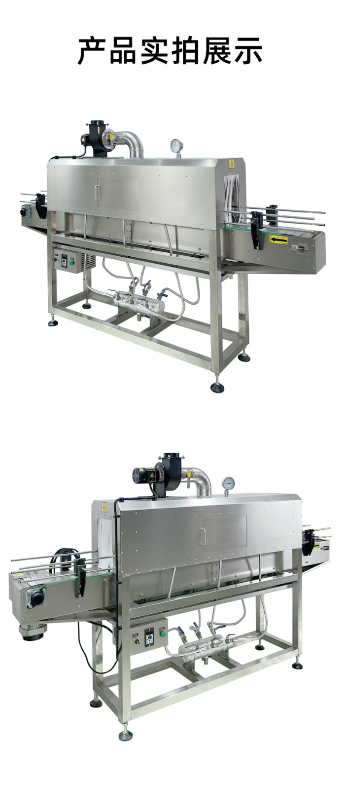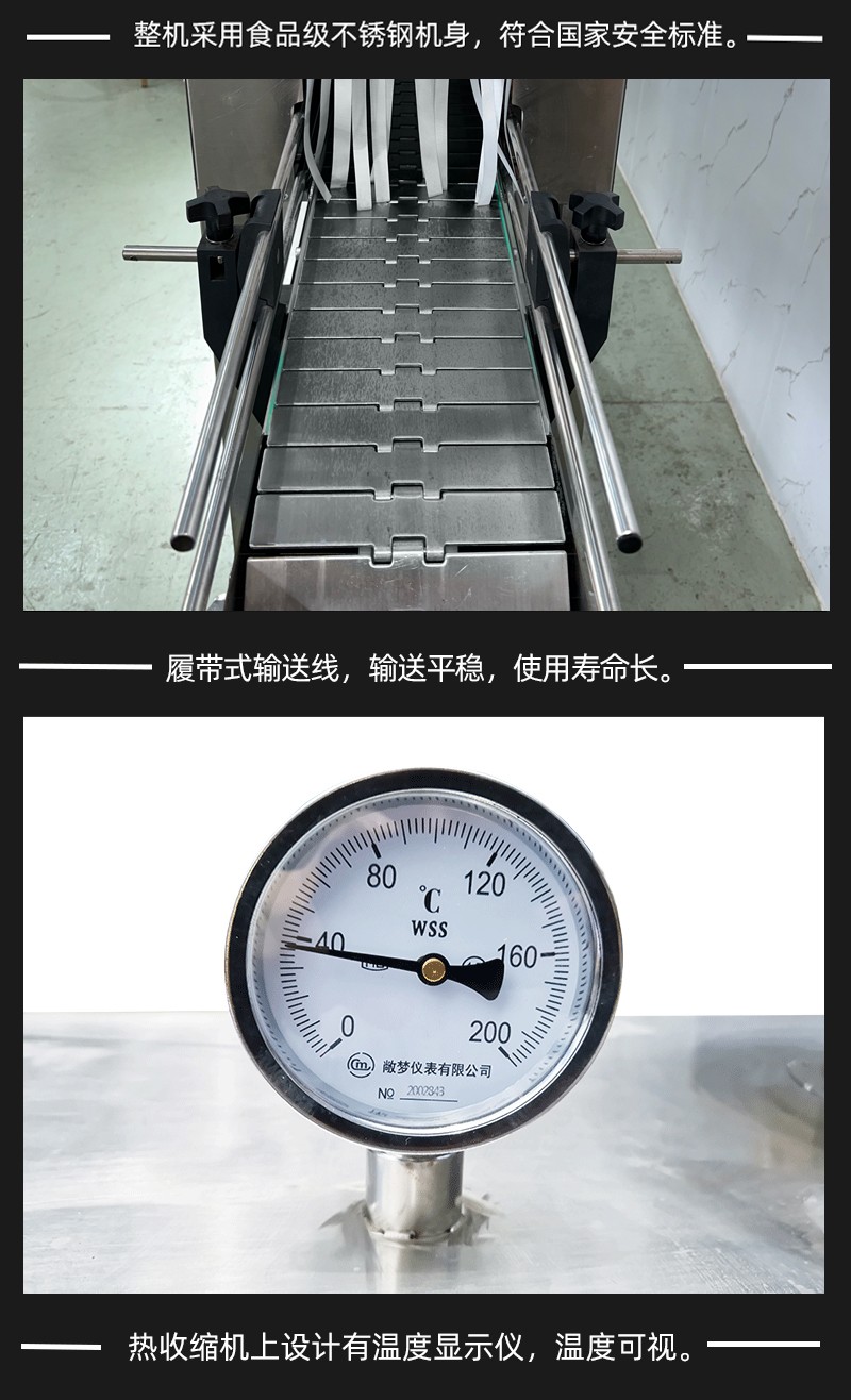 在收缩效果上,热风收缩受限于热风流动的不均匀性,容易出现局部温度过高或过低的情况,导致膜材收缩后表面产生褶皱、气泡,或边角处收缩不紧实,影响包装美观度;而蒸汽具有良好的渗透性和扩散性,能够均匀包裹产品和膜材的每一个部位,使膜材受热同步且均匀,收缩后能紧密贴合产品表面,无论是规则的瓶装,还是不规则的异形件,都能实现平整光滑的包装效果,大幅降低次品率。