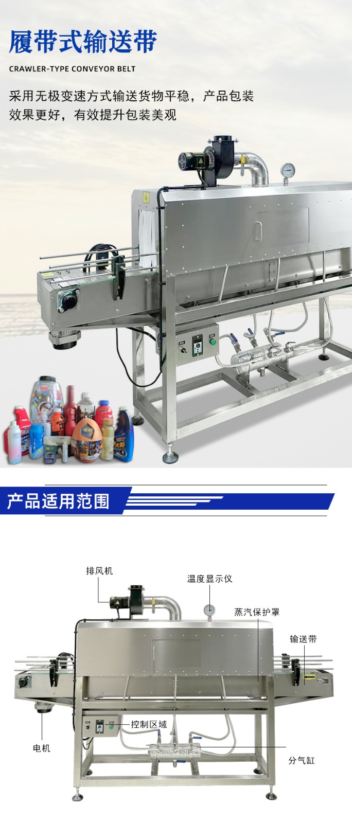 蒸汽收缩机是一种利用高温蒸汽对包装材料进行加热收缩的设备。将水转化为高温蒸汽,蒸汽经管道输送至收缩通道。产品包裹热收缩膜后进入收缩通道,蒸汽均匀喷射在膜表面,使膜材遇热迅速收缩,紧贴产品表面,离开蒸汽区域后,膜材自然冷却或经冷风系统快速定型,形成紧凑包装。