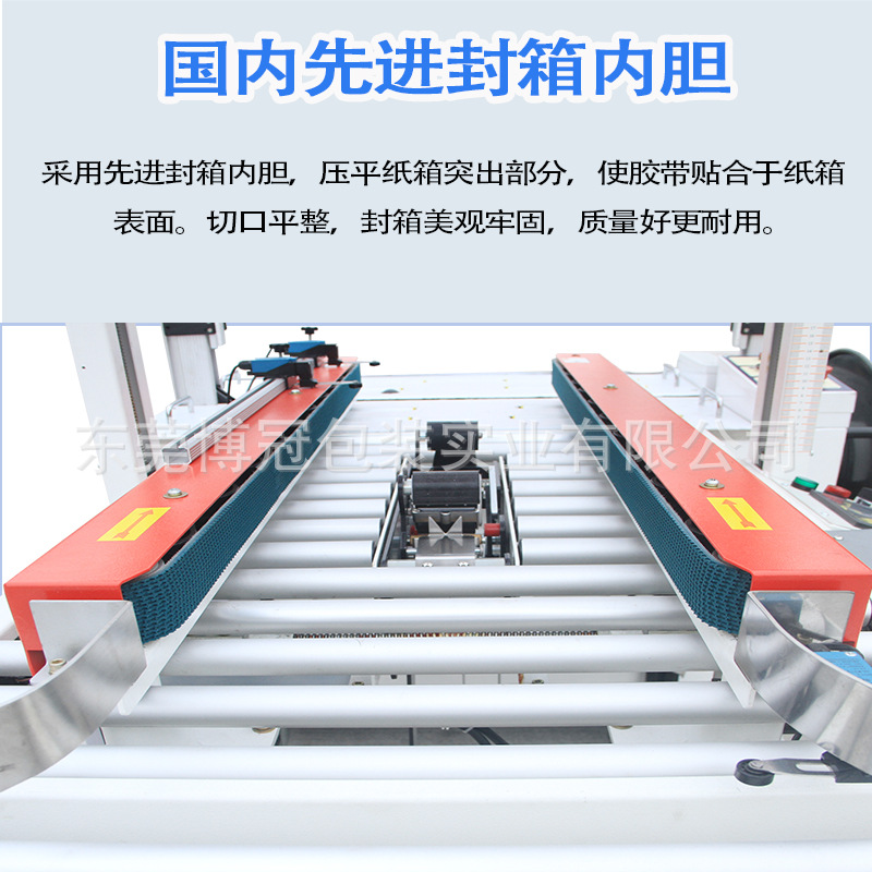 - 定位挡板和滚轮:定位挡板和滚轮用于对纸箱进行精准定位。当纸箱被传送带输送到封箱位置时,定位挡板会挡住纸箱,使其停止在正确的位置,同时,定位滚轮会从侧面接触纸箱,防止纸箱在封箱过程中发生偏移。
