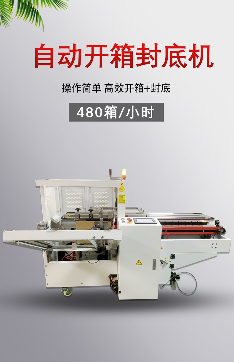 传统人工开箱封底需手动展开纸箱、折叠底盖、粘贴胶带,单人每分钟仅能完成 1-3 箱,且易受疲劳、熟练度影响;而自动开箱封底机通过机械联动与自动化控制,