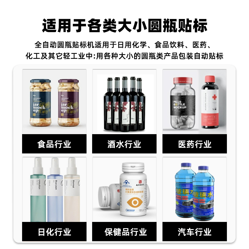 无需大量更换机械部件,即可兼容直径 30-100mm(部分可定制)的圆瓶,支持玻璃、塑料、金属等不同材质瓶身;同时能处理不干胶、监管码、防伪标等多种标签,换产时仅需在触摸屏调整参数,10 分钟内即可完成切换。