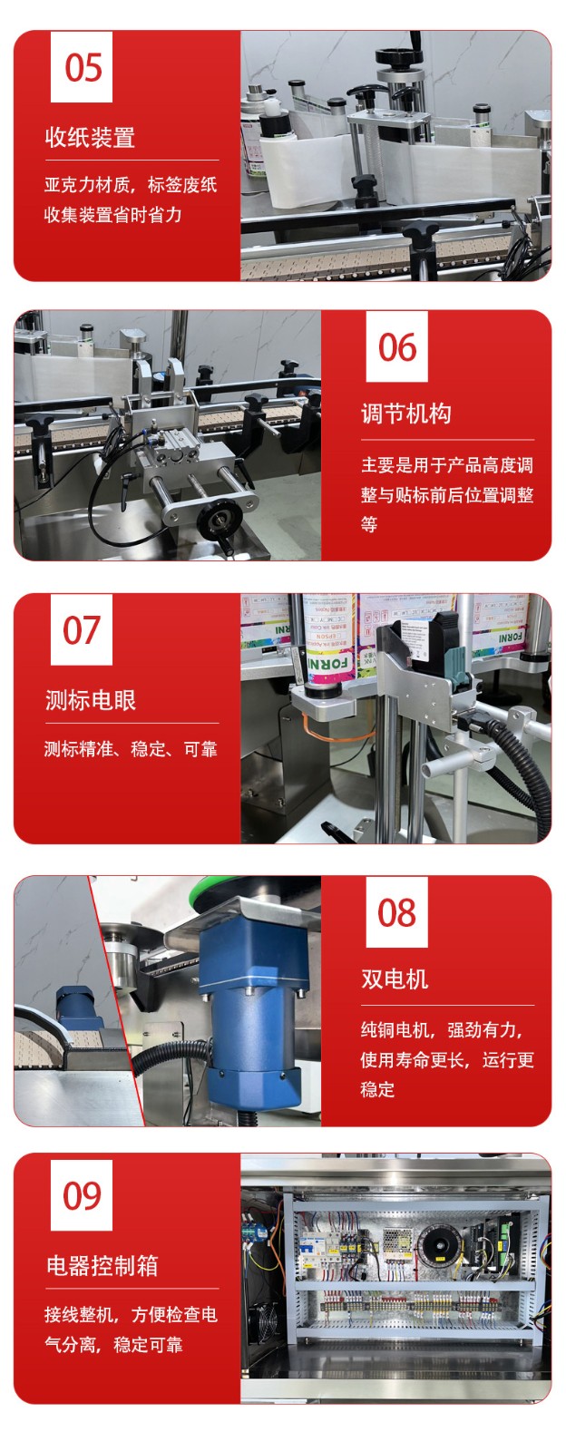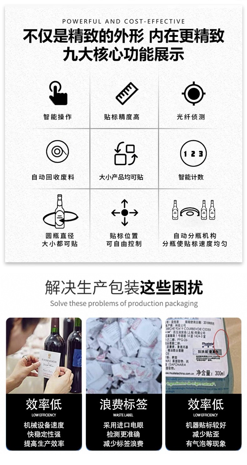 自带 “自动分瓶、无瓶不贴标、缺标报警” 功能,无需人工分拣瓶子或监控标签供给;部分机型还支持与前后生产线(如灌装机、装箱机)联动,形成全自动化包装流程,降低人工搬运和操作失误的风险。