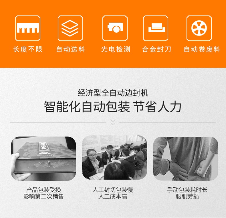 - 封口原理:纵向连续封切,不依赖产品长度:边封机的封切刀采用 “纵向边封” 设计,封切动作沿产品侧面纵向完成,而非横向切断整段薄膜。封刀可持续不间断工作,只要产品能通过输送线输送,就能同步完成边封和薄膜包裹,无论产品是 1 米长的铝型材、2 米长的木地板,还是更长的管材、相框,都能实现完整包装,彻底突破传统设备的长度限制。