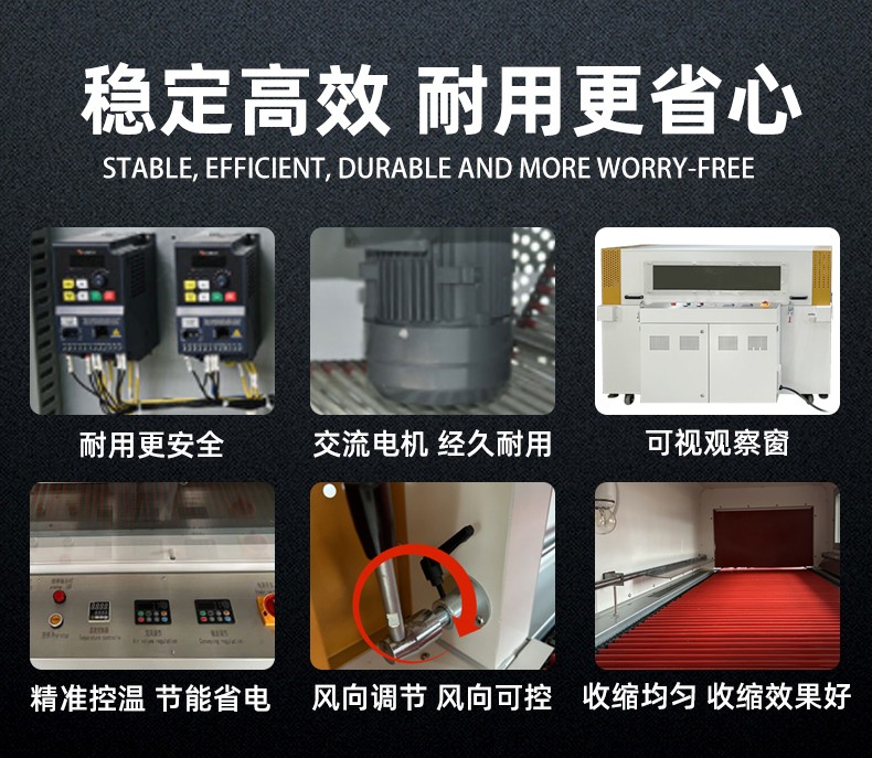 - 适配性自动化调整:通过导膜装置高度调节、进料输送平台升降等设计,无需更换模具或制袋器,即可自动适配不同宽度、高度的产品;部分机型还带有自动打孔放气装置,根据产品需求自动排出包装内空气,保证收缩效果平整。