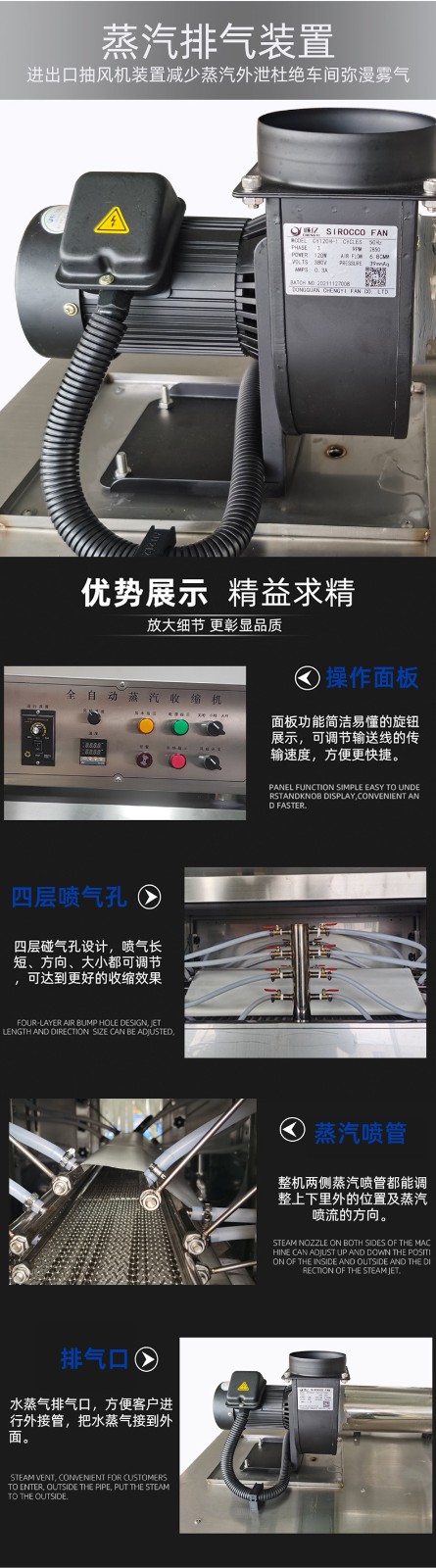 - 收缩室:产品在输送系统的带动下进入收缩室,与蒸汽充分接触,使包装材料收缩。收缩室的设计需保证蒸汽均匀分布。