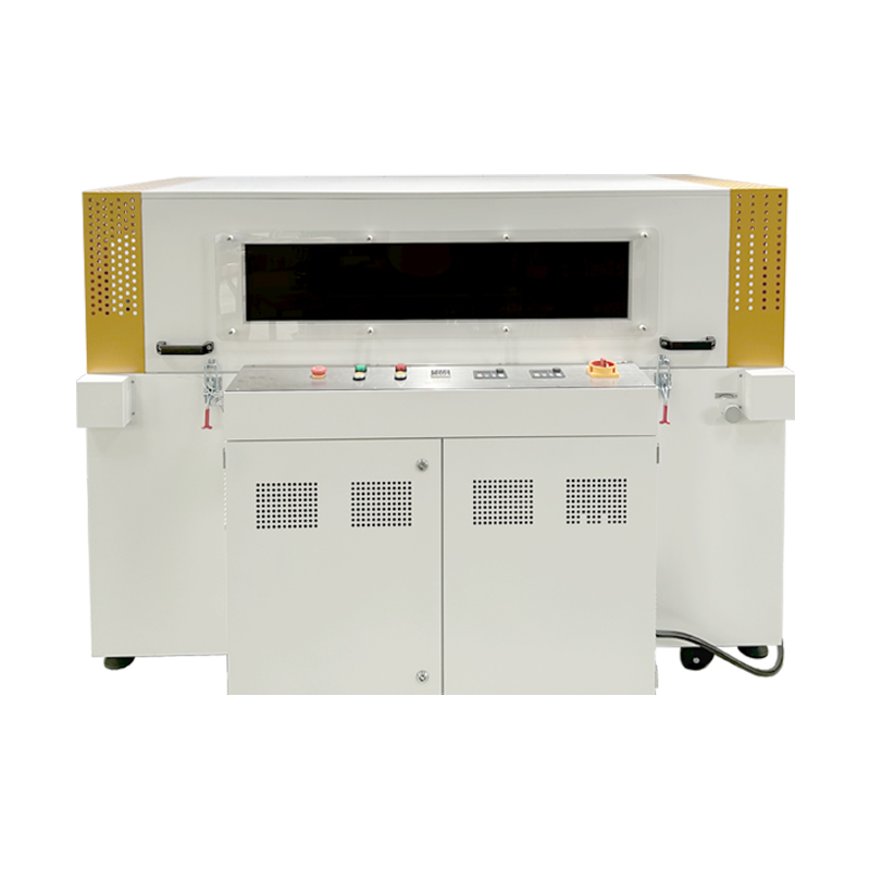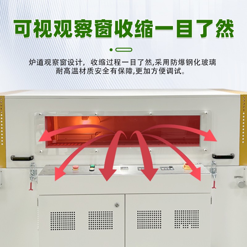 - 热风分布均匀,适配不同规格产品的无死角收缩普通热收缩机的风机为定速运行,风量和气流方向固定,炉内容易形成局部气流死角:面对大件、异形或整箱堆叠的产品时,靠近风口的部位收缩过度,远离风口的部位收缩不足,导致包装成品凹凸不平;面对小件零散产品时,还可能出现薄膜被气流吹偏移的问题。双变频系统中,风机转速与加热功率联动可调,再配合炉腔内的多向导流风道设计,能形成上下左右立体循环热风。在高速生产时,变频提升风机转速,增强气流穿透力,确保大件产品内部和边角都能均匀受热;在小批量生产时,降低风机转速,避免小件产品薄膜偏移。无论是单个零件、整箱饮料还是异形五金件,都能实现无死角均匀收缩。