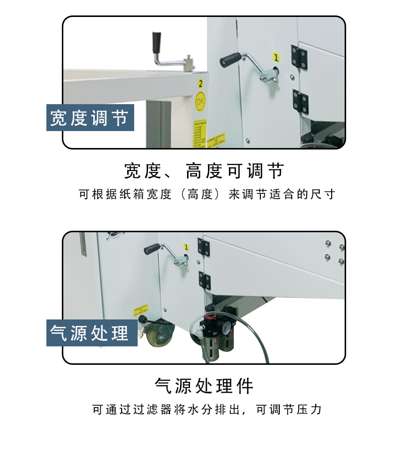 • 适用范围广:可适用于各种材质和尺寸的纸箱,无论是纸质较硬的重型纸箱,还是普通的轻型纸箱,都能进行良好的封箱操作。对于不同规格的纸箱,只需对机器进行简单的调整即可适应。