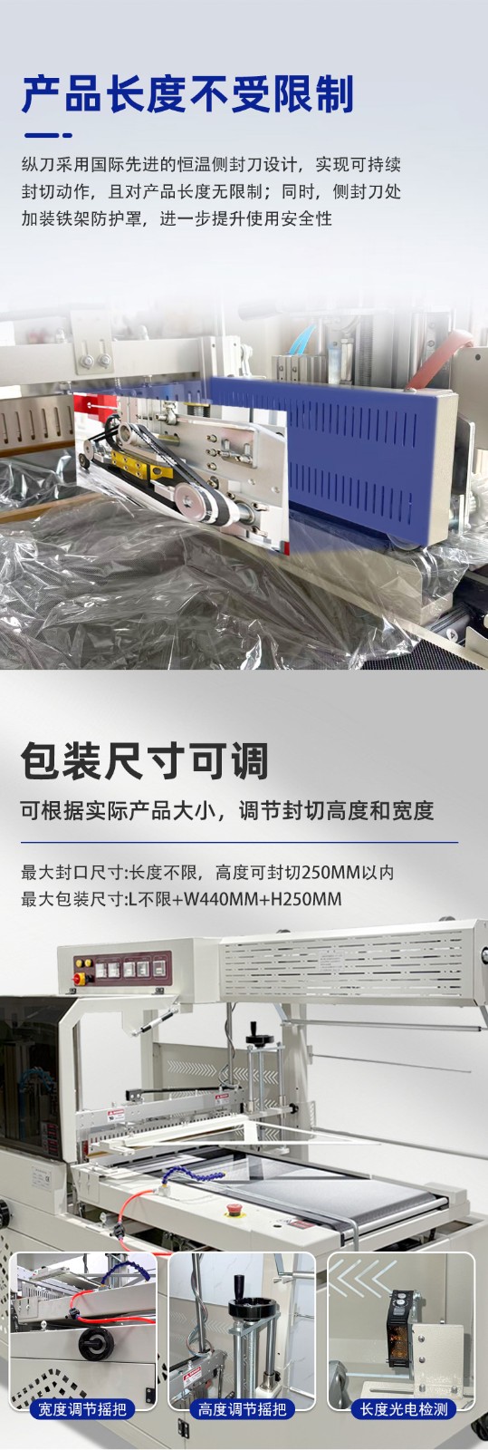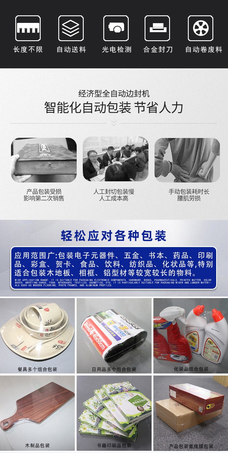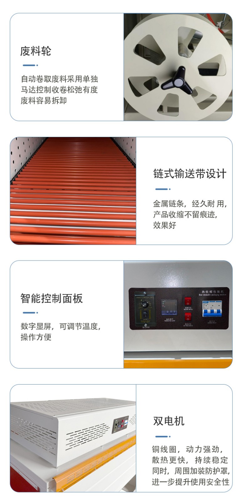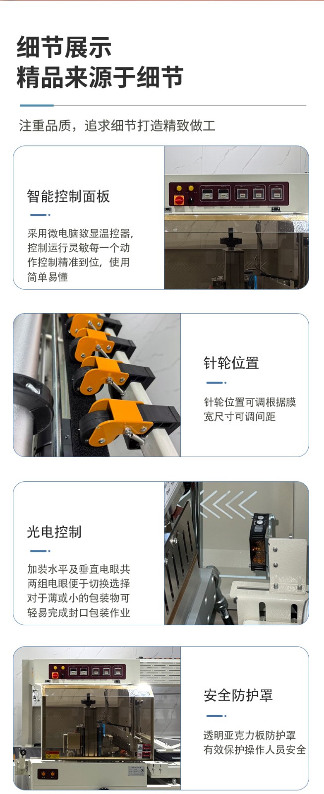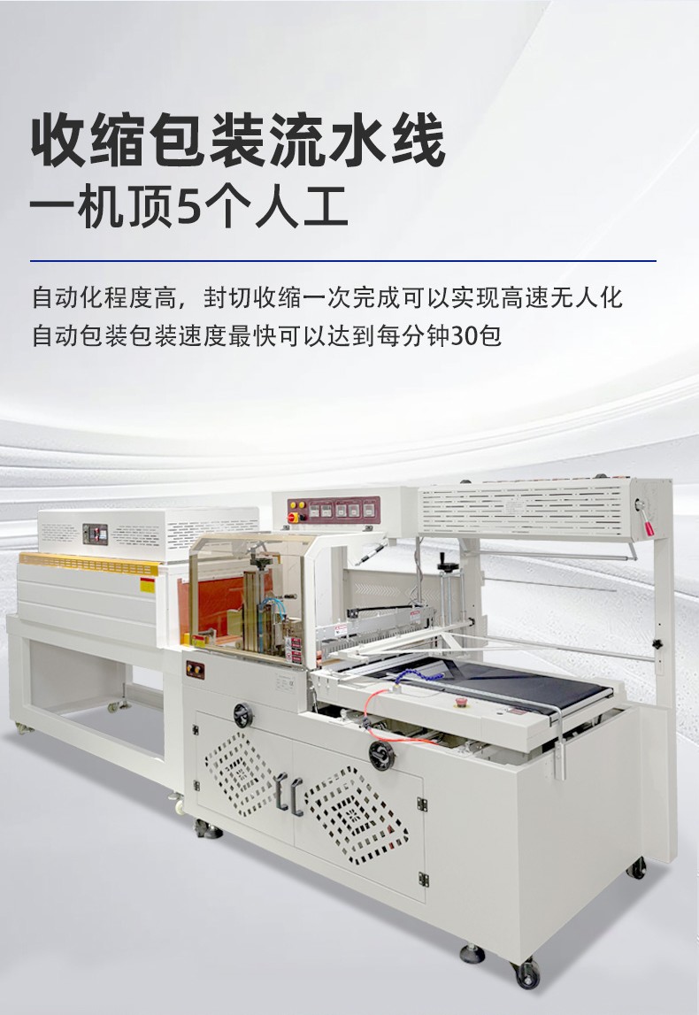 全自动边封热收缩机的控制系统是整个设备的 “大脑”,它负责协调和控制各个部件的运行,以实现高效、精准的包装过程。以下是对其控制系统的详细介绍: 硬件组成 PLC 控制器 核心运算与控制:PLC(可编程逻辑控制器)是控制系统的核心部件。它接收来自各个传感器的信号,如产品到位传感器、薄膜检测传感器等,根据预设的程序进行逻辑运算和处理,并向各个执行元件发送控制指令,如驱动电机、气动元件等,以精确控制送料、套膜、封切和热收缩等各个包装工序的执行顺序和时间。 稳定性与可靠性:具有高可靠性,能在恶劣的工业环境下稳定工作,抗干扰能力强,可确保设备长时间连续运行而不出现故障,保证包装过程的稳定性和一致性。 触摸屏 人机交互界面:触摸屏作为人机交互的窗口,为操作人员提供了直观、便捷的操作平台。操作人员可以通过触摸屏幕轻松设置各种包装参数,如封切时间、收缩温度、输送速度等。同时,触摸屏还能实时显示设备的运行状态,如当前工作模式、各部件的运行参数、故障报警信息等,方便操作人员随时了解设备运行情况并及时进行调整和维护。 参数设置与存储:支持多种参数的设置和存储,可根据不同的产品包装需求,预设多个包装方案,操作人员只需在触摸屏上选择相应的方案,即可快速切换设备的工作参数,无需重新逐一设置,大大提高了工作效率。此外,触摸屏还具备密码保护功能,可防止非授权人员随意修改参数,确保设备运行的安全性和稳定性。 软件功能 参数设置与调整功能 精确控制:通过控制系统的软件,能够精确设置和调整封切时间、收缩温度、输送速度等关键参数。例如,封切时间可以精确到毫秒级,收缩温度可在一定范围内以较小的温度梯度进行调整,输送速度也能根据产品尺寸和包装要求进行精确设定,从而保证不同产品都能获得理想的包装效果。 自动调节与优化:部分先进的控制系统还具备自动调节功能,能够根据预设的包装质量标准,自动对参数进行微调优化。例如,在热收缩过程中,系统可根据热收缩膜的收缩情况,自动调整加热温度和风机风速,以确保热收缩膜均匀收缩,紧密贴合产品表面。 运行监控与故障诊断功能 实时监控:控制系统实时监控设备各个部件的运行状态,包括电机的转速、加热元件的温度、气动元件的压力等。通过传感器将这些实时数据反馈给 PLC 控制器,再由触摸屏以图形化界面的形式展示给操作人员,使操作人员能够直观地了解设备的运行情况。 故障诊断与报警:一旦检测到设备出现异常情况,如温度过高、电机过载、薄膜供应不足等,控制系统会立即进行故障诊断,并在触摸屏上显示详细的故障信息和报警提示。同时,系统还会自动记录故障发生的时间、位置和相关参数,以便维修人员快速定位和排除故障。有些控制系统还具备远程监控和报警功能,可通过网络将故障信息发送给相关人员的手机或电脑,实现及时响应和处理。 生产数据统计与管理功能 数据统计:控制系统能够自动统计生产过程中的各种数据,如包装数量、生产速度、设备运行时间、故障停机时间等。这些数据对于企业的生产管理和质量控制具有重要意义,可帮助企业分析生产效率、评估设备性能、制定生产计划和进行成本核算。 数据存储与查询:生产数据可存储在控制系统的内存或外部存储设备中,方便操作人员随时查询和调用。同时,数据还可通过网络接口导出到计算机或企业的生产管理系统中,以便进行进一步的分析和处理,为企业的决策提供数据支持。 通信与联网功能 内部通信:控制系统通过内部通信总线实现各个硬件模块之间的高速数据传输和通信,确保 PLC 控制器、触摸屏、传感器和执行元件等之间的信息交互准确、及时,从而实现设备各部件的协同工作。 外部联网:一些高端的全自动边封热收缩机控制系统支持外部联网功能,可通过以太网、WiFi 等方式与企业的生产管理系统或其他设备进行联网通信。这样,企业可以实现对多台设备的集中监控和管理,优化生产流程,提高生产效率和管理水平。例如,在一个大规模的包装生产线上,通过联网功能可以将多台热收缩机与前端的灌装设备、后端的贴标设备等进行整合,实现整个包装生产线的自动化和智能化控制